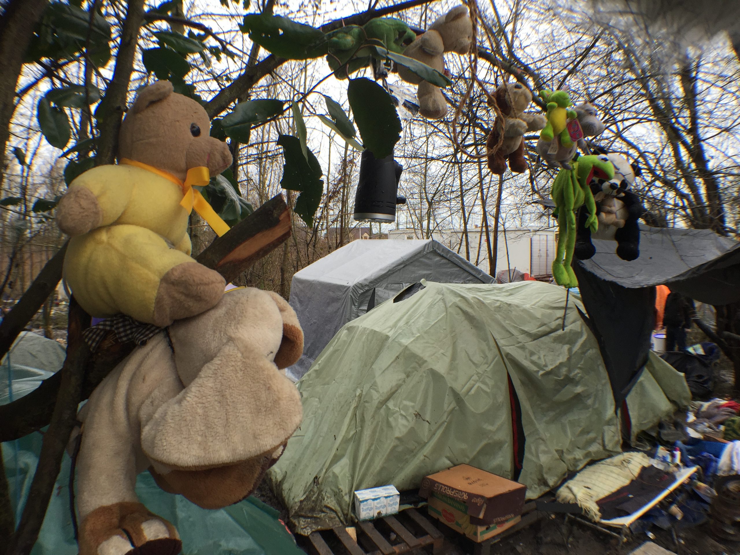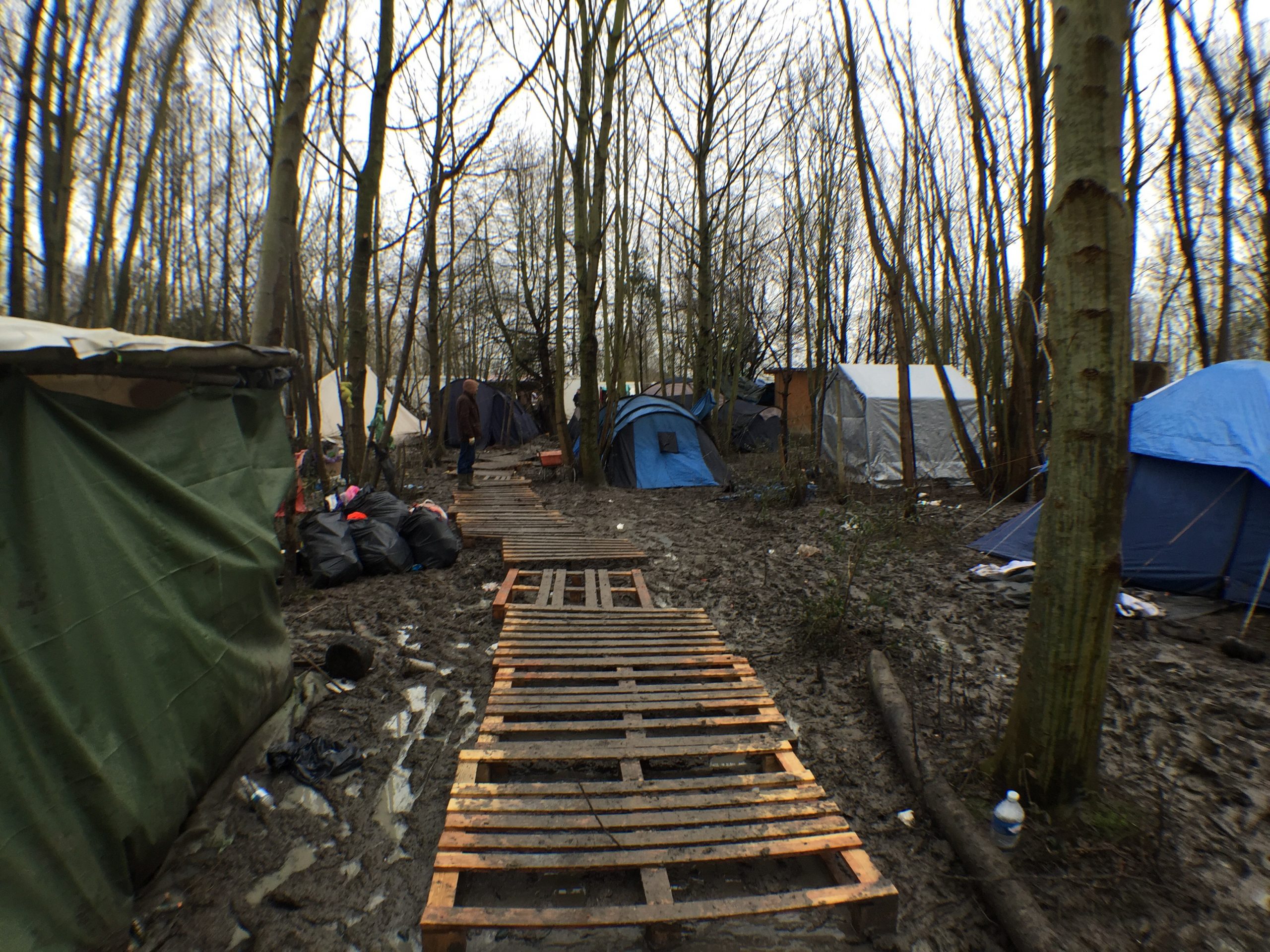 La potenza del clima atlantico e la deliberata indifferenza del governo francese sono riusciti a far registrare un nuovo livello record di squallore e violenza verso persone vulnerabili e indifese. Eppure vedere in questa fetida distesa di acqua e terra marcia, bambini giocare e sorridere rende la misura dell’orrore dal quale sono fuggiti.