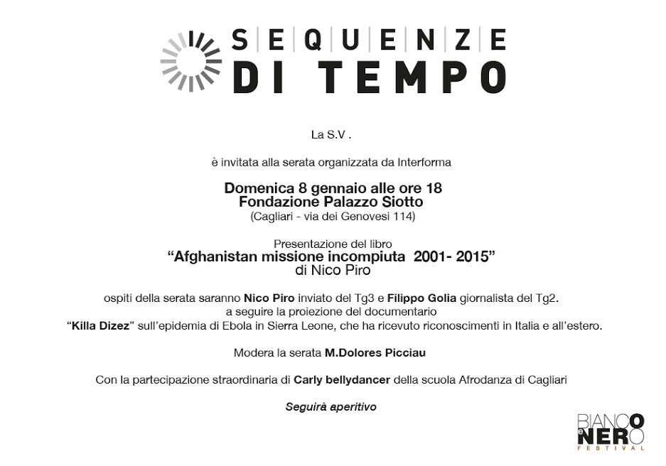 8 gennaio Cagliari – nell’ambito del festival Sequenze di Tempo, Maria Dolores Picciau presenta l’incontro con me e Filippo Golia, reporter del Tg2, parleremo di Afghanistan, di epidemie, di guerre e di aree di crisi. A seguire la proiezione di “Killa Dizez, vita e morte al tempo di Ebola”.