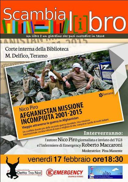 La quarantaseiesima volta è stata quella di “Afghanistan Missione Incompiuta”, grazie all’organizzazione del locale gruppo di volontari di Emergency. Ed è stato incoraggiante vedere una sala piena in un venerdì freddo nonostante mesi segnati da emergenze per l’Abruzzo, dal sisma all’emergenza neve con black out da vergogna nazionale; emergenze che hanno spostato persone, abitudini ed equilibri di una cittadina fuori dai circuiti turistici ma con un piccolo gioiello, la biblioteca Delfico che ha ospitato la presentazione aprendo una bellissima corte, mentre i piani superiori erano chiusi (precauzionalmente) per inagibilità.