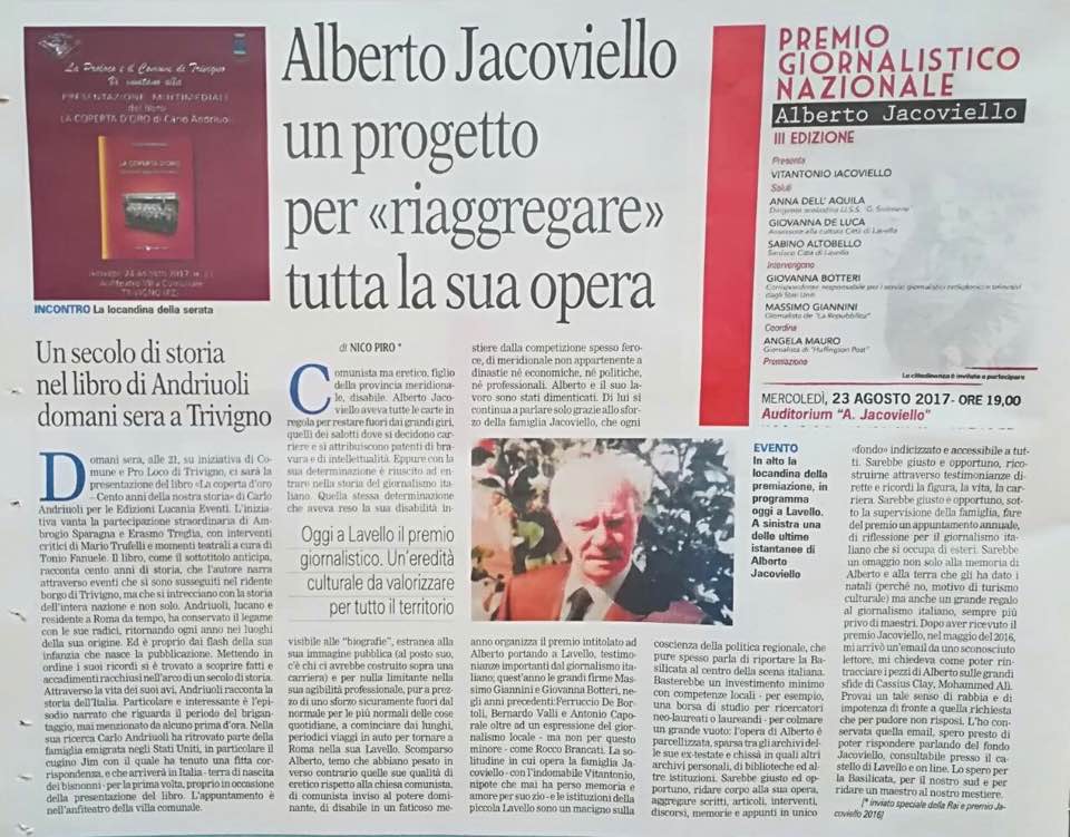 Oggi 23 agosto si celebra la terza edizione del premio intitolato ad Alberto Jacoviello, in occasione di questo evento la Gazzetta del Mezzogiorno pubblica un mio intervento, ecco il testo: