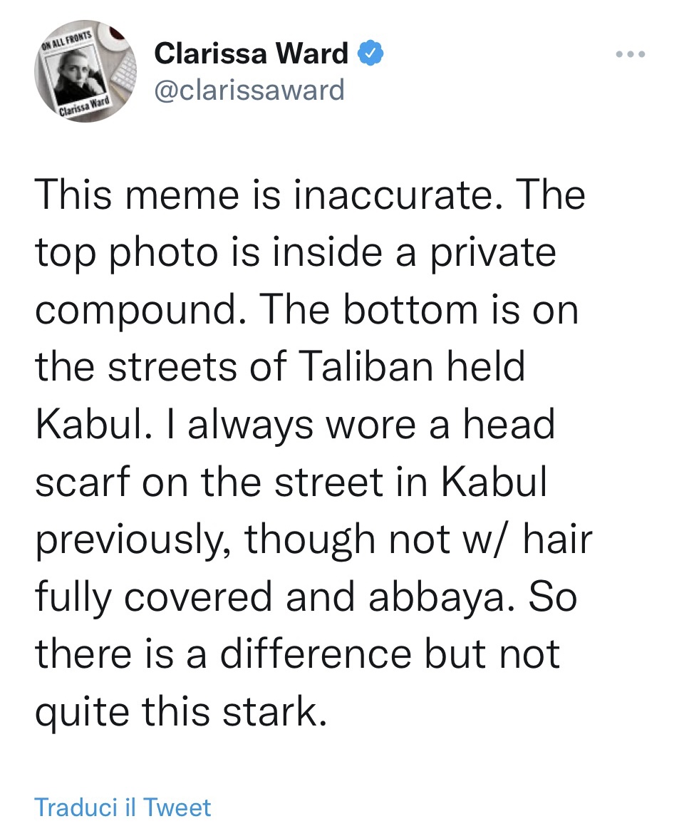 Come scrivevo ieri, è emblematico il caso della corrispondente CNN che è libera di andare in giro per la città, qualcuno in un “meme” ne ha mostrato le due versioni prima e dopo l’arrivo dei talebani ma lei stessa ha precisato che la foto sopra è in una sede chiusa, l’altra in strada è poco diversa dal passato (velo più ampio ma sempre velo).