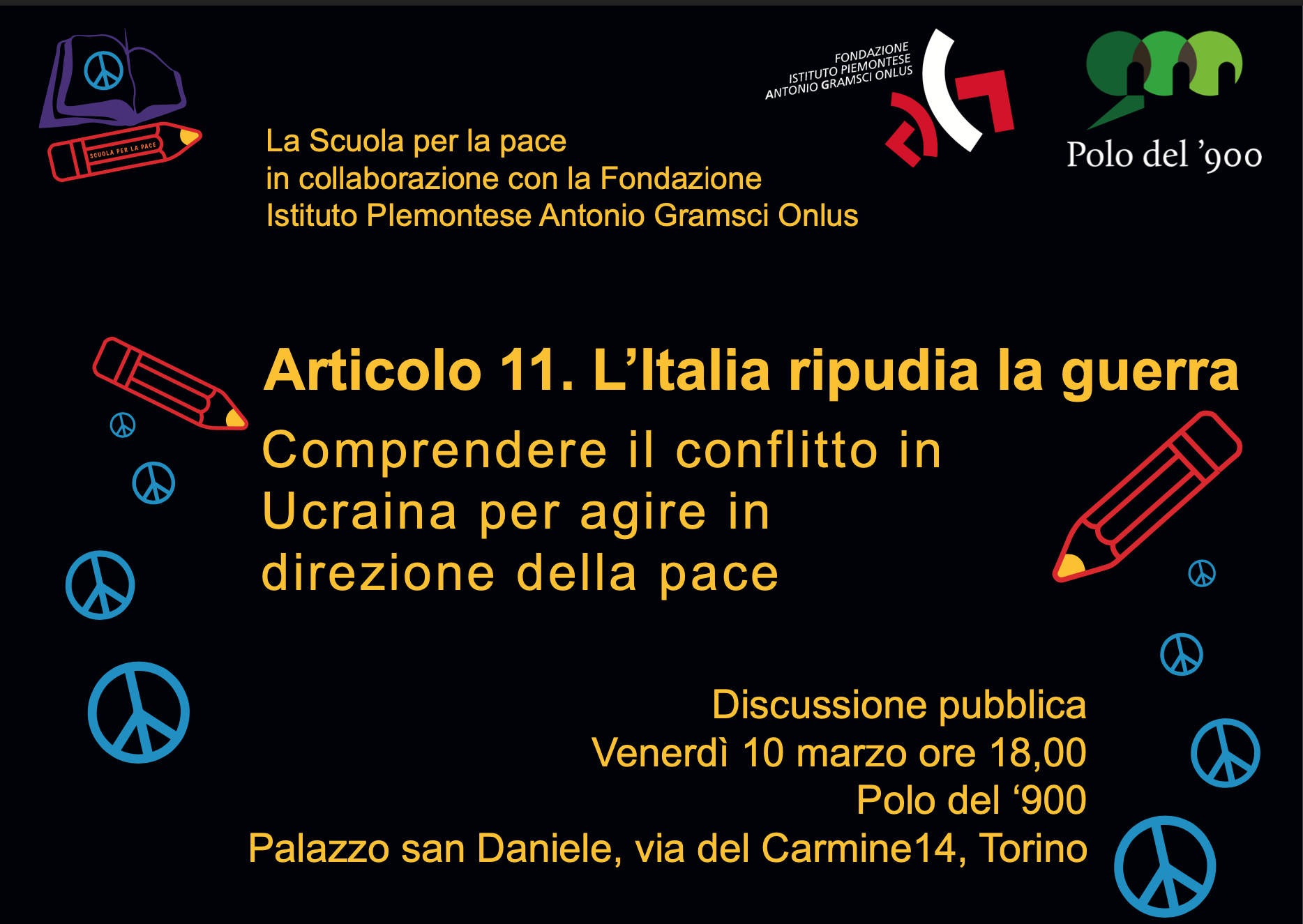 Il comitato la Scuola per la pace di Torino e la Fondazione Gramsci organizzano per il dieci marzo un incontro a Torino, al polo del 900 (Palazzo San Daniele) alle ore 18.