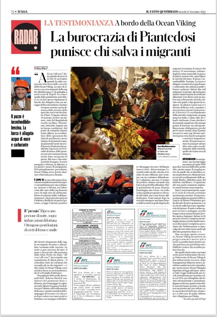 Giorni dopo la sua uscita in edicola (giovedì 23 novembre)L, quindi nel rispetto del lavoro della redazione, pubblico il testo della mia testimonianza pubblicato da “Il Fatto Quotidiano” sulla mia esperienza a bordo di Ocean Viking
