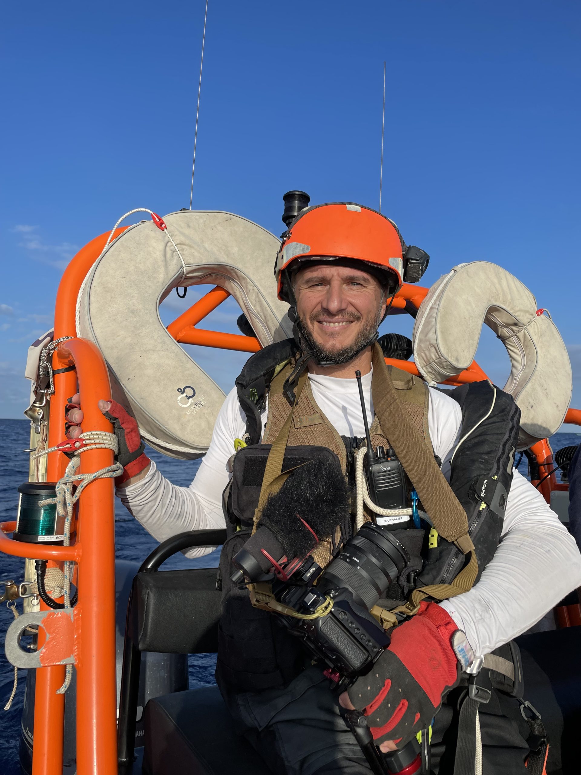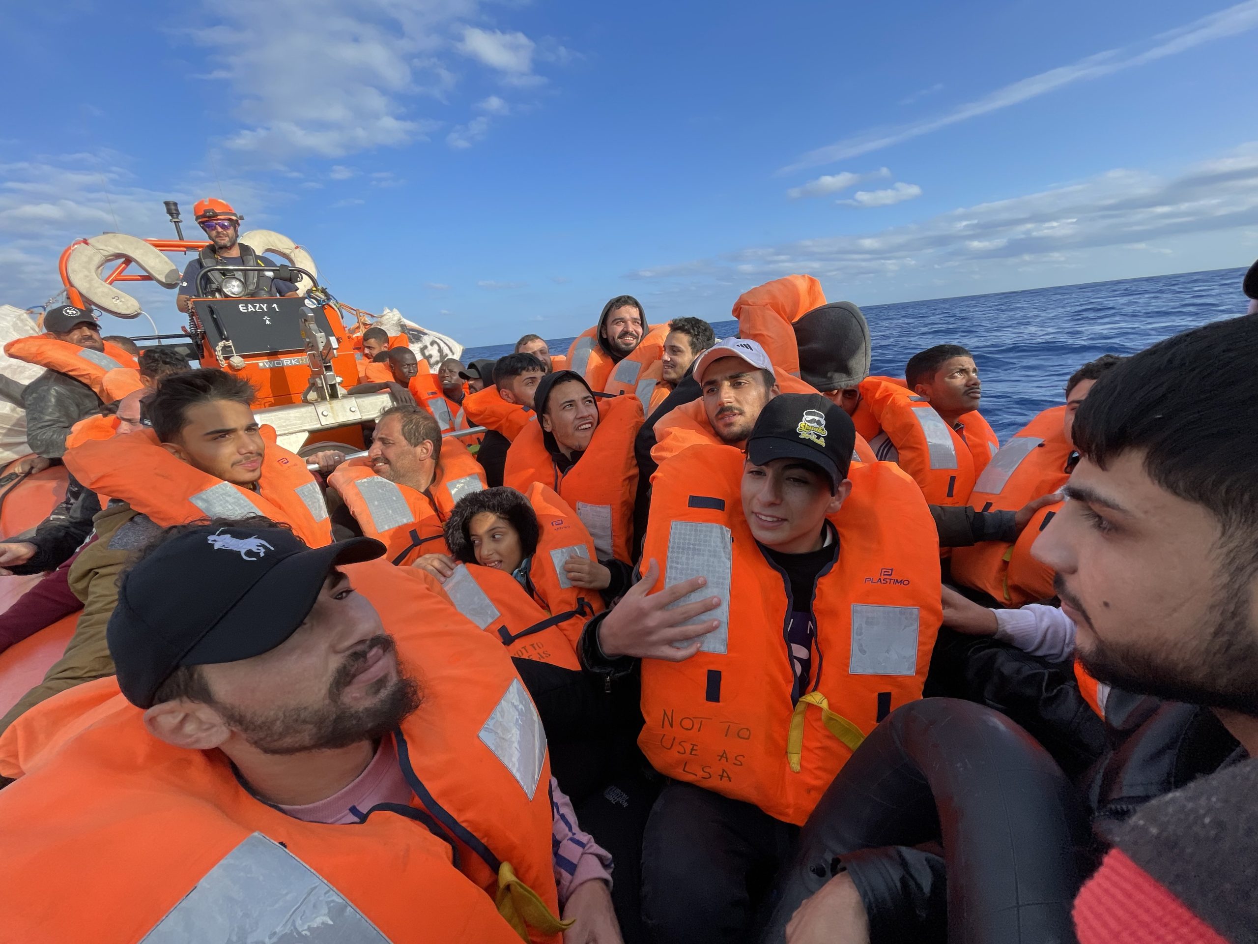 Eazy 1 va in avanscoperta, a quasi 35 nodi di velocità scrutiamo un’orizzonte circolare. E’ una ricerca impossibile ma spunta Colibri 2. L’aereo di Pilotes-Volontaires guida dal cielo il nostro gommone e va in circolo sulla barca per segnalarcela da lontano. Il mare è calmo eppure la barca ondeggia, perché troppo carica e piena d’acqua (al solito mista a benzina). Salvare le 61 persone a bordo (compresa una famiglia siriana con due bimbi intorno ai dieci anni) è complesso, per evitare che l’imbarcazione si capovolga devono intervenire anche gli altri due gommoni, Eazy 2 e 3.